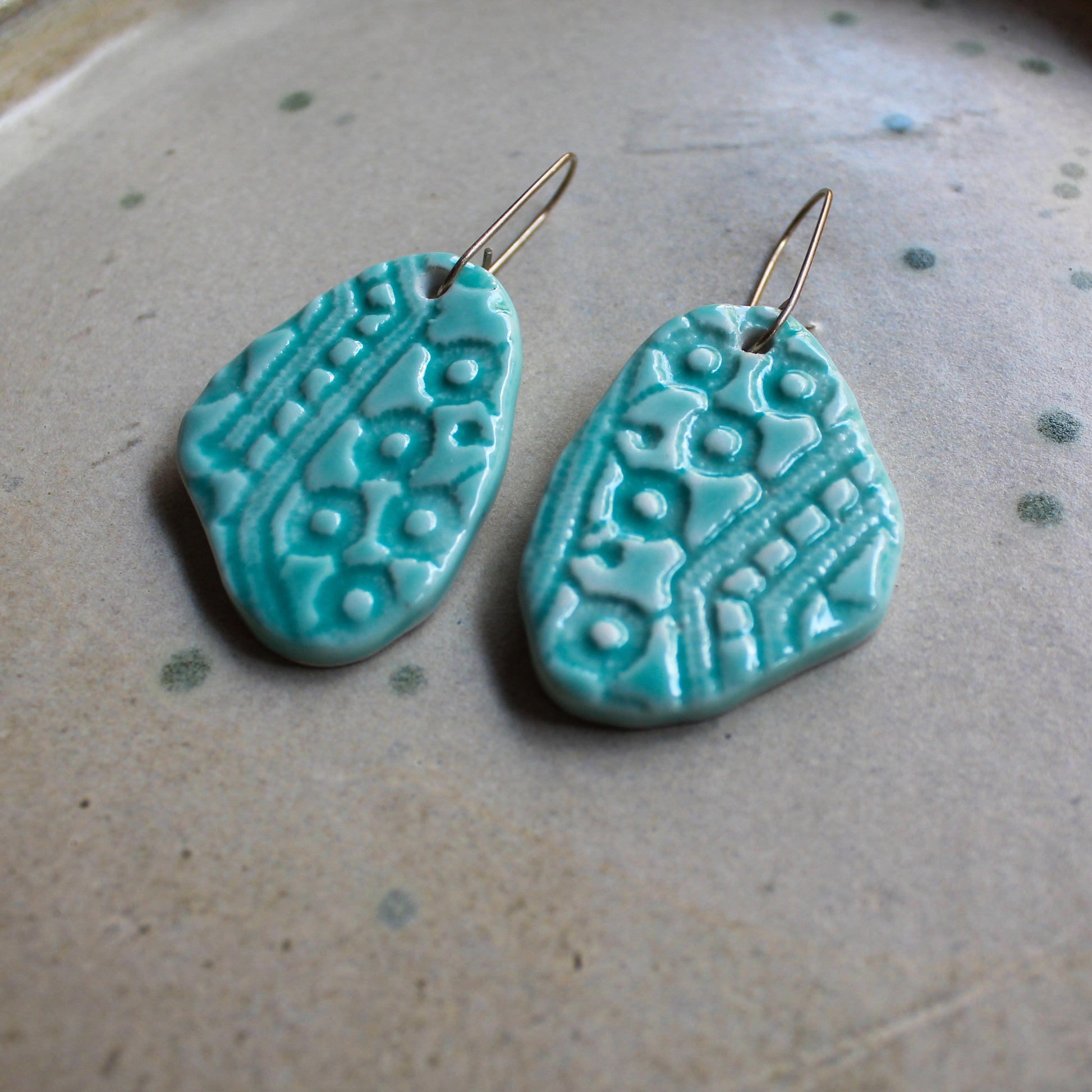 A unique and modern pair of earrings with lace textured porcelain. Porcelain has been fired twice in a high temperature kiln (up to 1240oC). For the final result I've used glaze. Earwires are handmade from sterling silver.