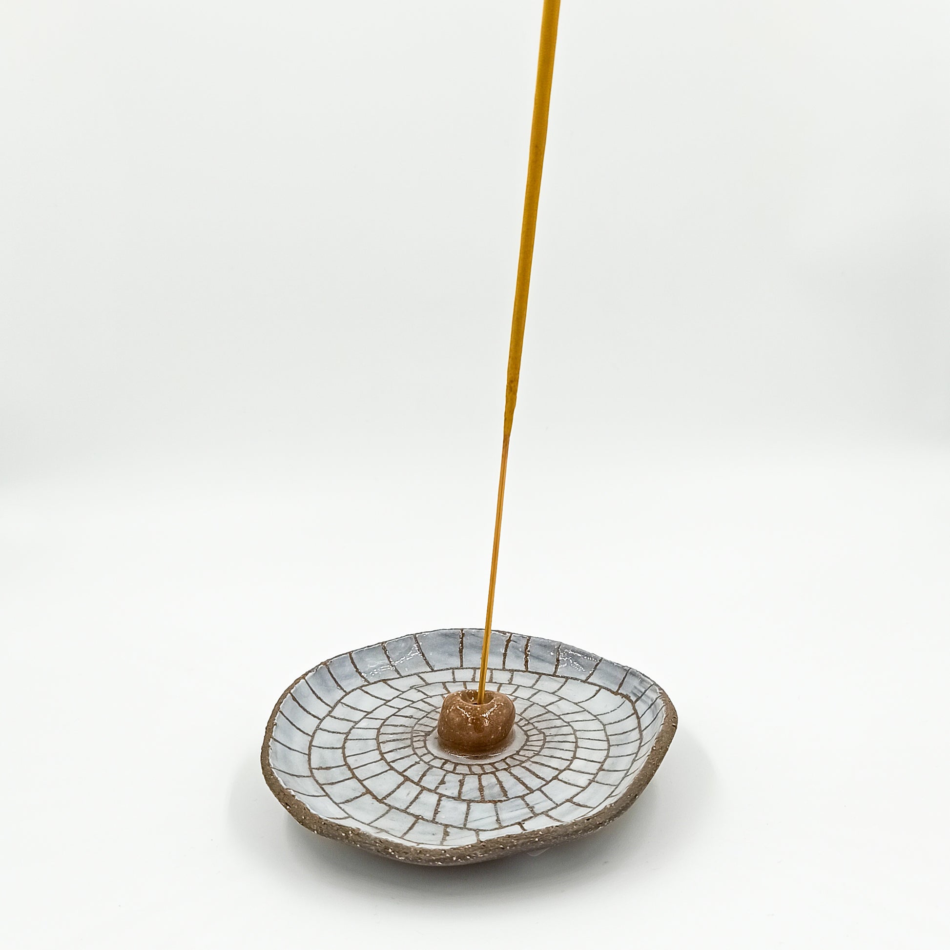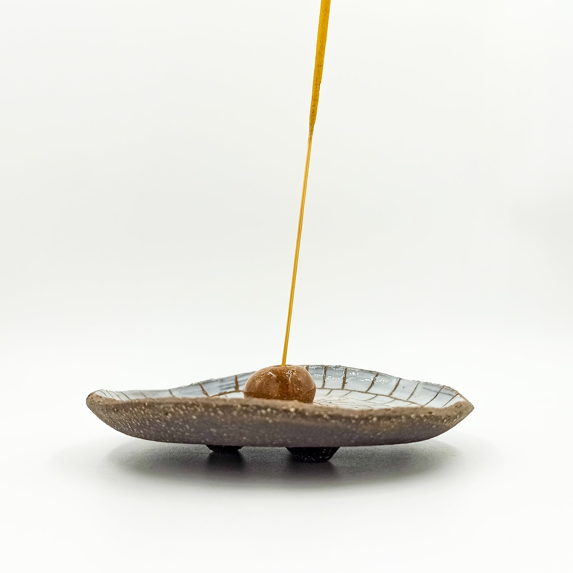 This handbuilt ceramic incence burner is made from black stoneware clay. It has been fired twice in a high temperature kiln (up to 1240oC). For the final result I've used porcelain slip and clear glaze.