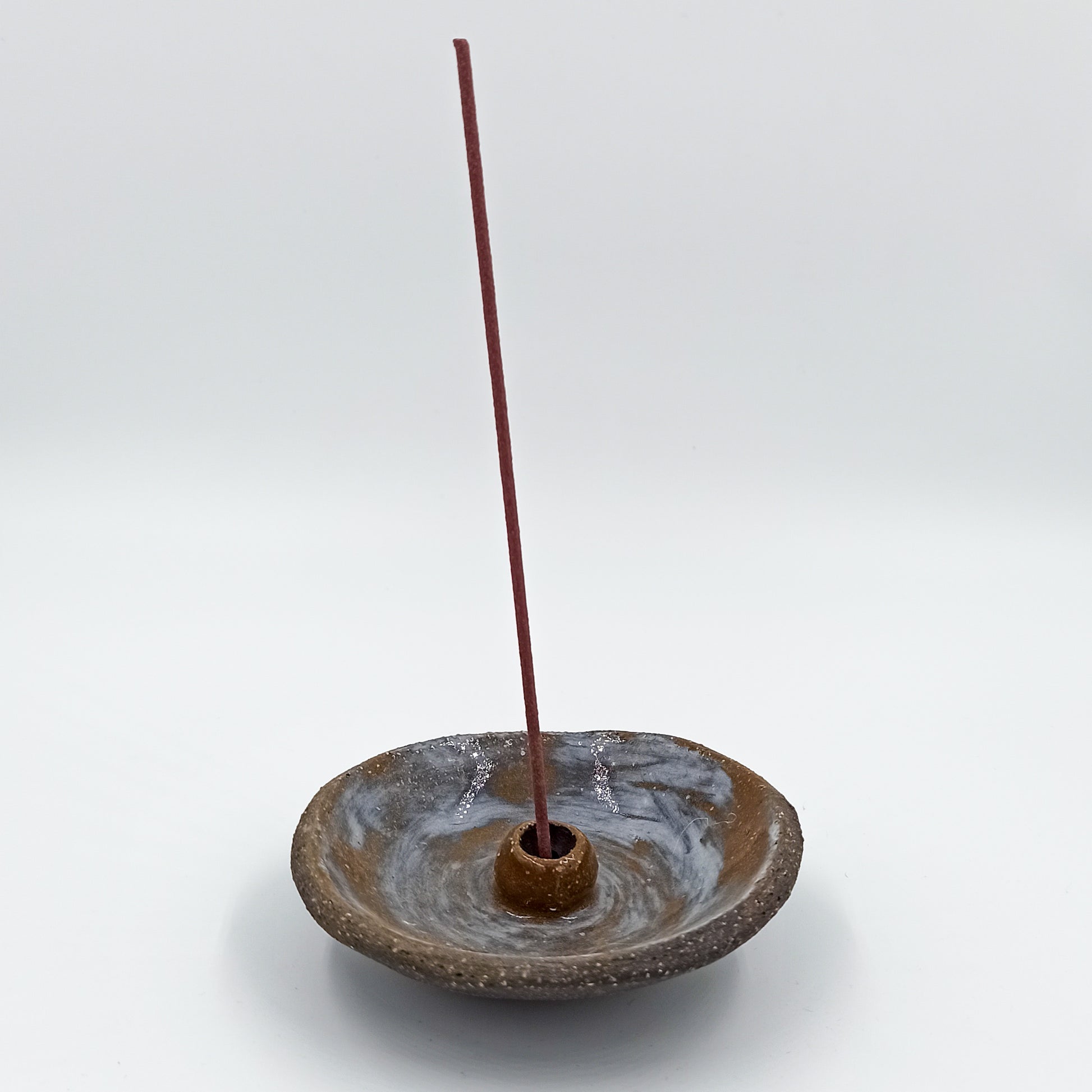 This handbuilt ceramic incence burner is made from black stoneware clay. It has been fired twice in a high temperature kiln (up to 1240oC). For the final result I've used porcelain slip and clear glaze.