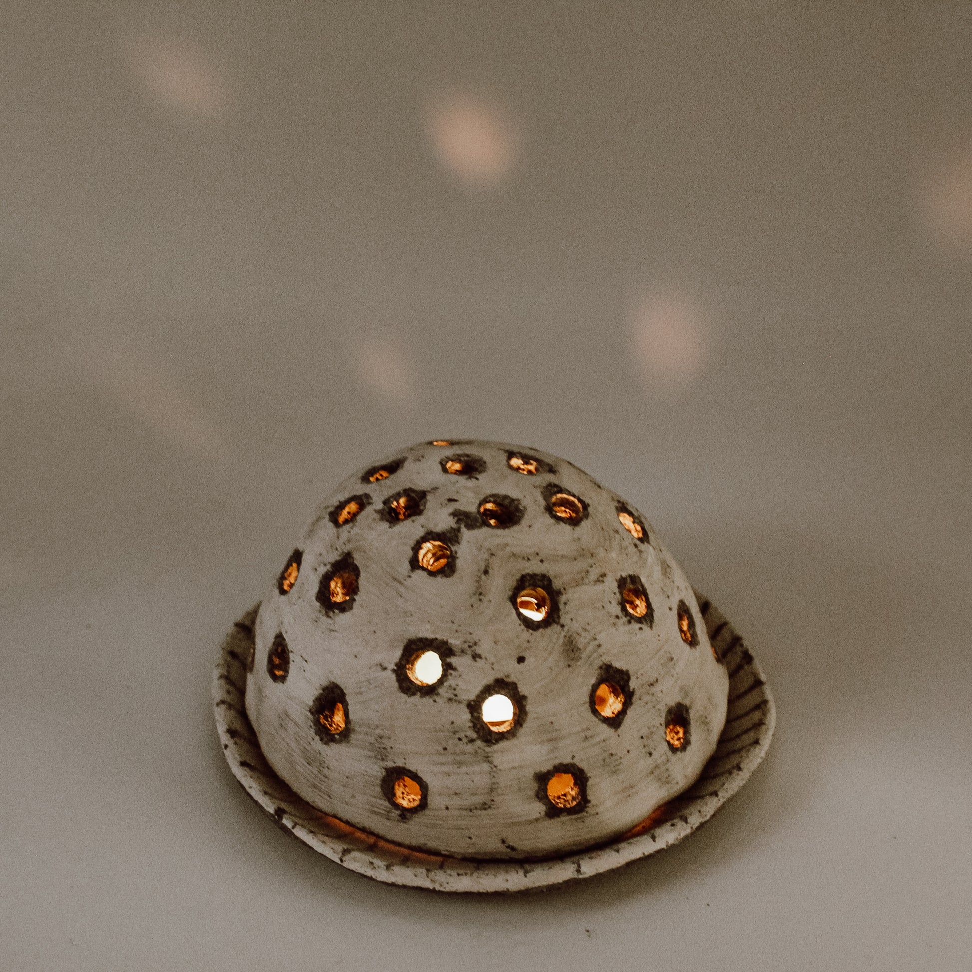 This handbuilt ceramic smoke incence is made from black stoneware clay. It has been fired in a high temperature kiln (up to 1240oC). For the final result I've used porcelain slip. It can also be used as tealight holder. It looks lovely and twinkly with a candle burning inside, as the light shines through the little holes.