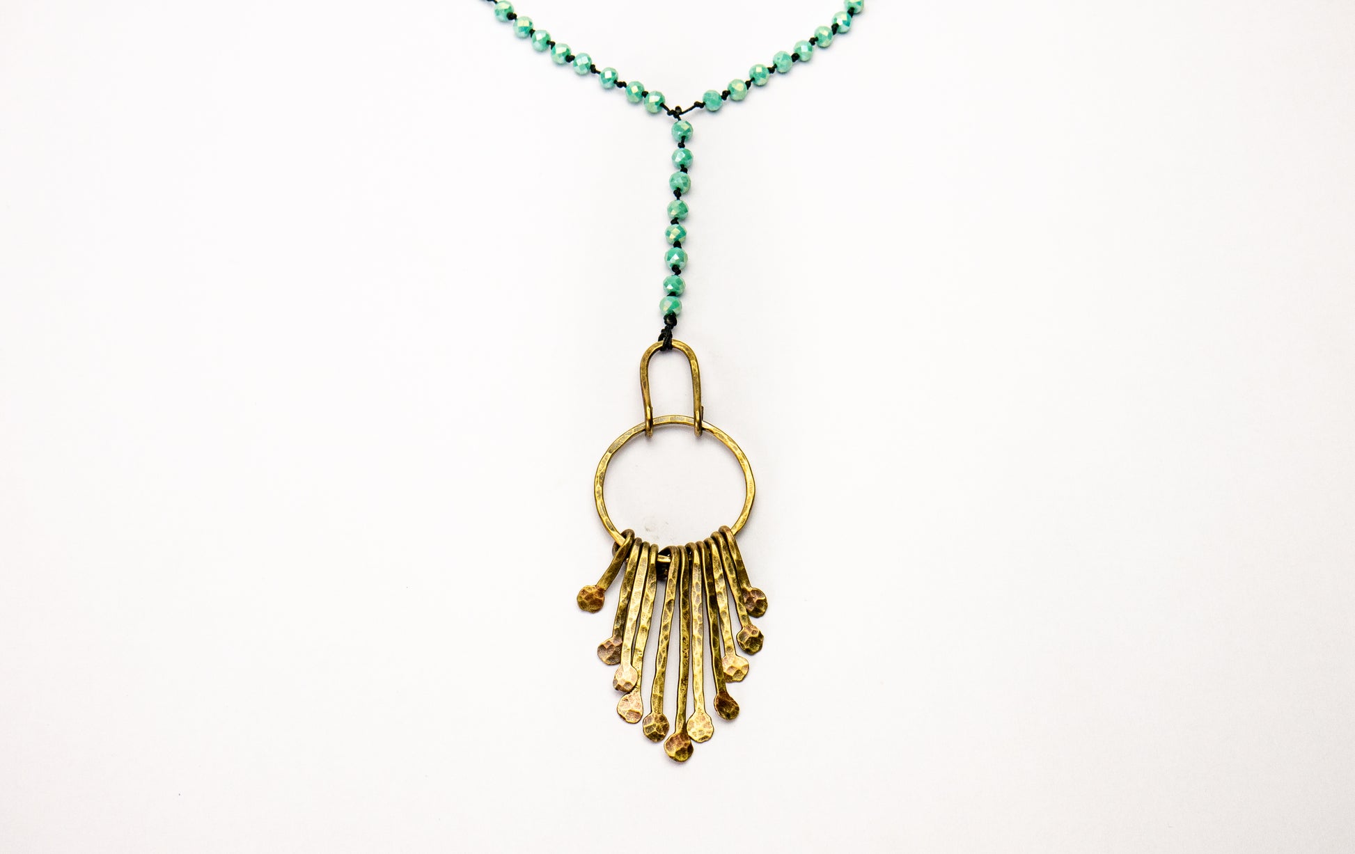 An eyecatching long handhamered oxidized brass necklace with faceted beads (rosary style).