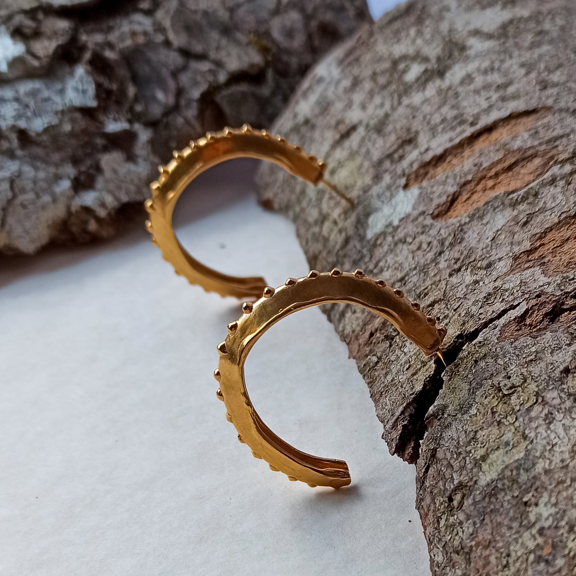 Hoop earrings decorated with golden dotes. Handtextured and gold plated for more glamorous look. Lightwear and very comfortable.