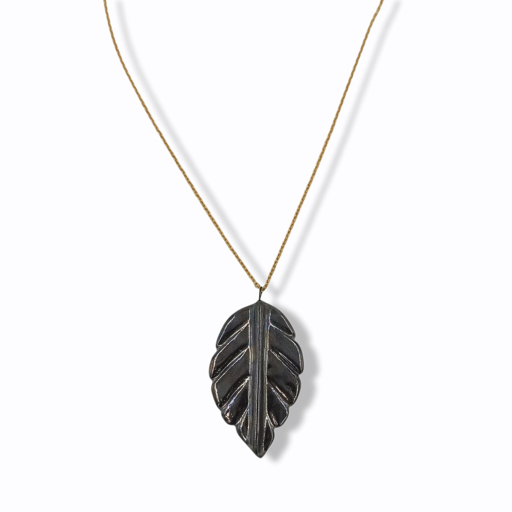 An eye catching long necklace with porcelain leaf. A dynamic and elegant necklace. Handcrafted for those who value and appreciate unique work of hands.