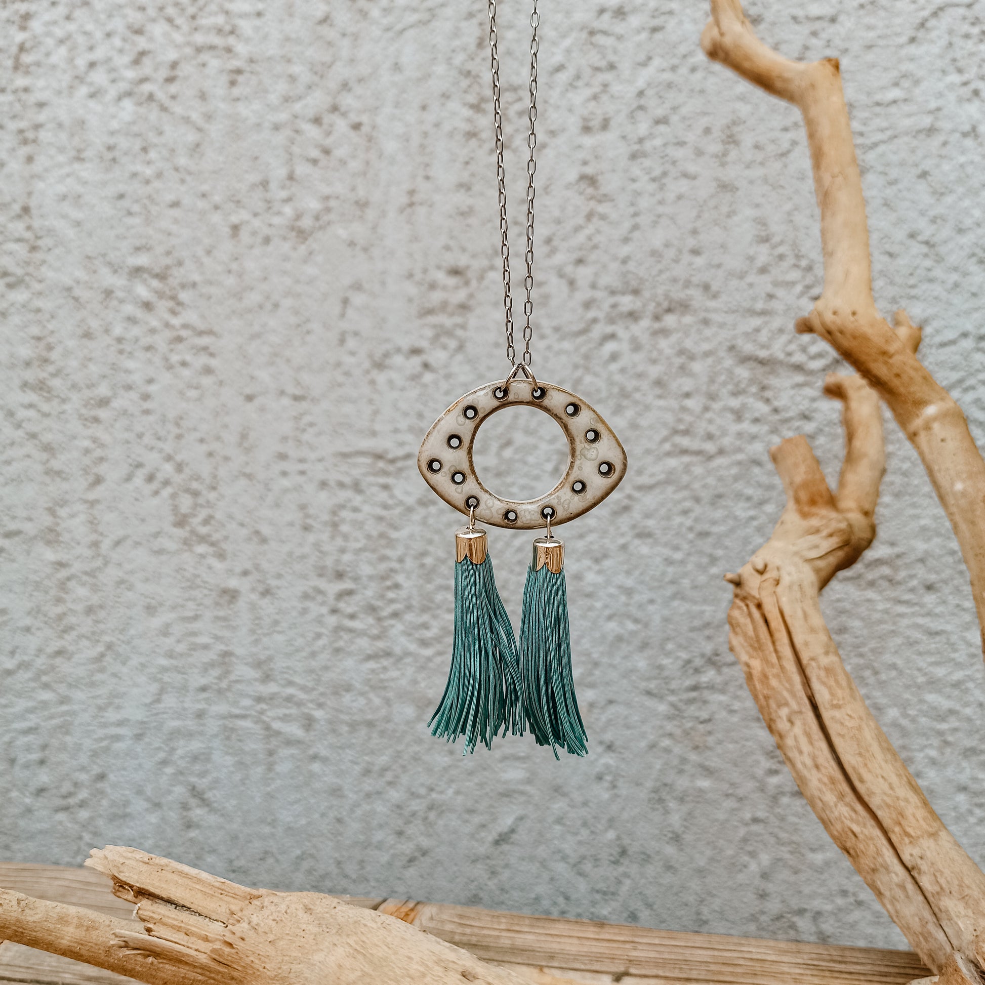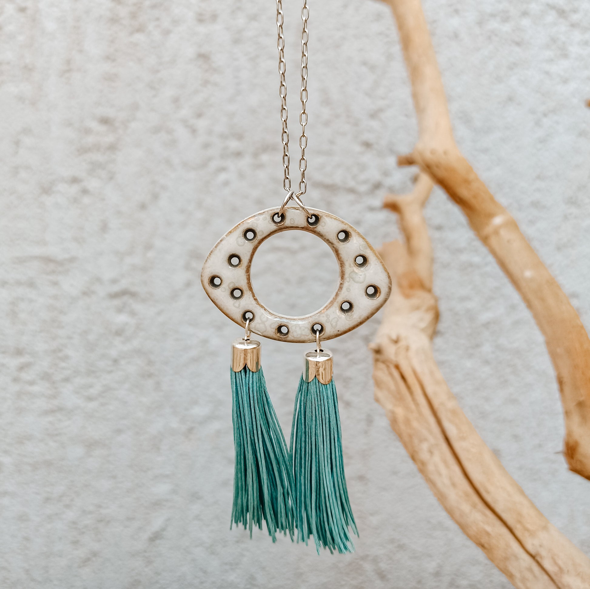 Handmade long necklace made with black porcelain. It is fired twice in a high temperature kiln (up to 1240oC). For the final result I've used textured glaze. The back side which was touching the kiln is left unglazed. The two tassels are handmade. Light and comfortable to wear. Due to their handmade nature they are totally unique.