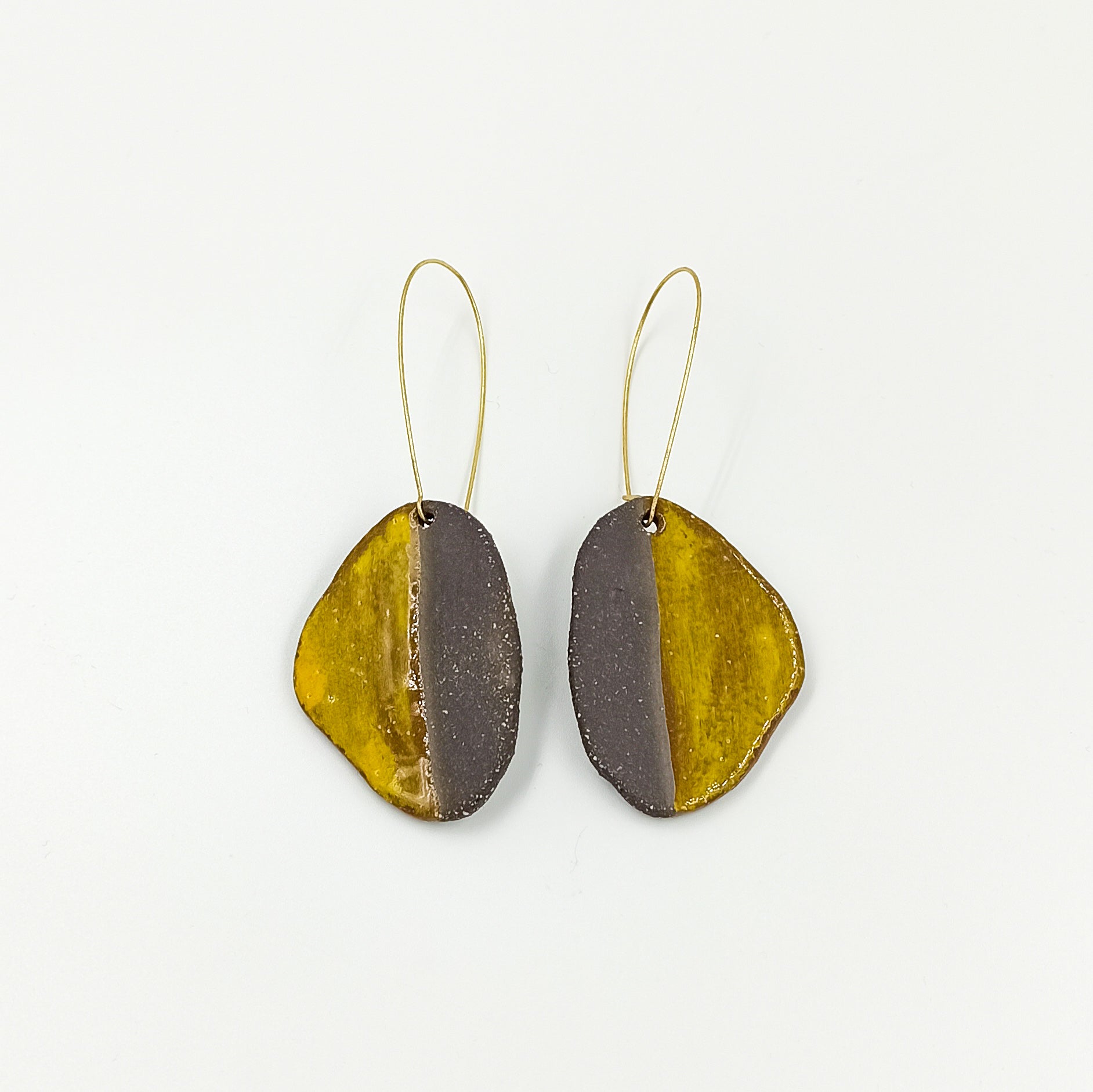 This pair of earrings is handmade with black stoneware clay fired twice in a high temperature kiln (up to 1240oC). For the final result I've used yellow glaze and clear glaze. The back side which was touching the kiln is left unglazed. They are hanging from gold plated long hooks. Light and comfortable to wear.Due to their handmade nature they are totally unique.