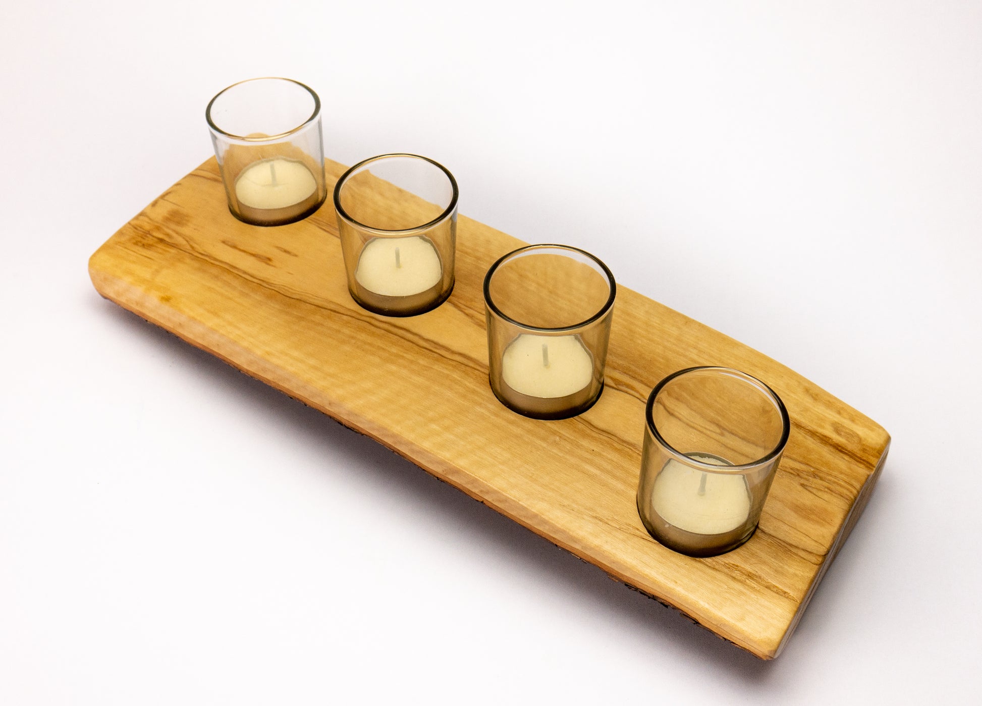 Handcrafted eco friendly candle holder that adds organic beauty to your space. Perfect in any space. A perfect addition to your bedroom, living room, entryway, or home office. Has been lovingly crafted from a solid piece olive. Glass candle holders are included.