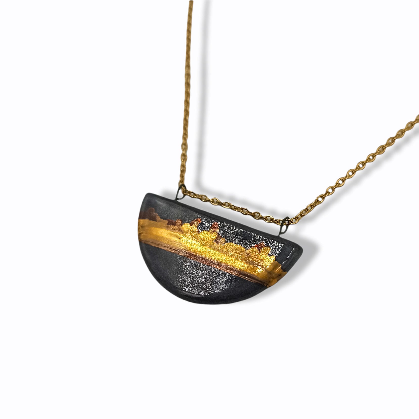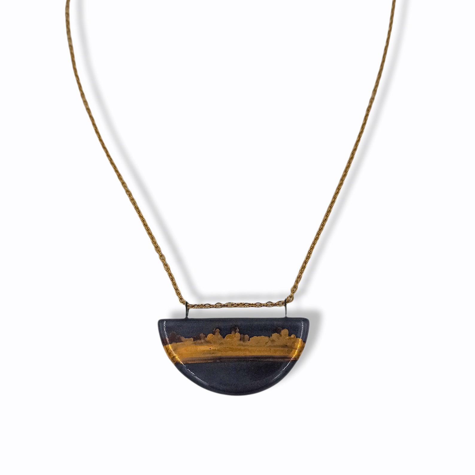 An eye catching long necklace with half circle porcelain. A dynamic and elegant necklace. Handcrafted for those who value and appreciate unique work of hands.