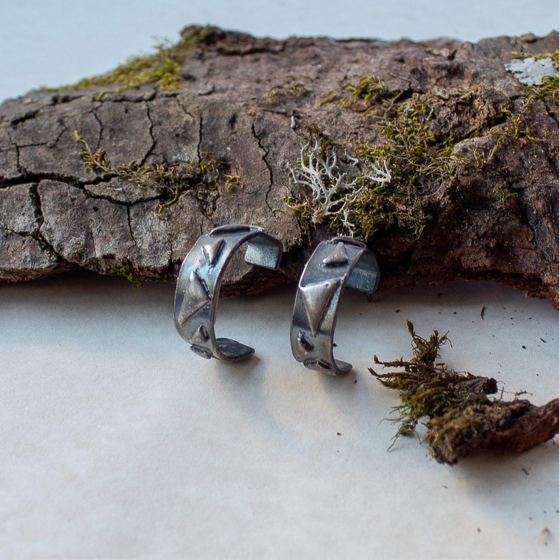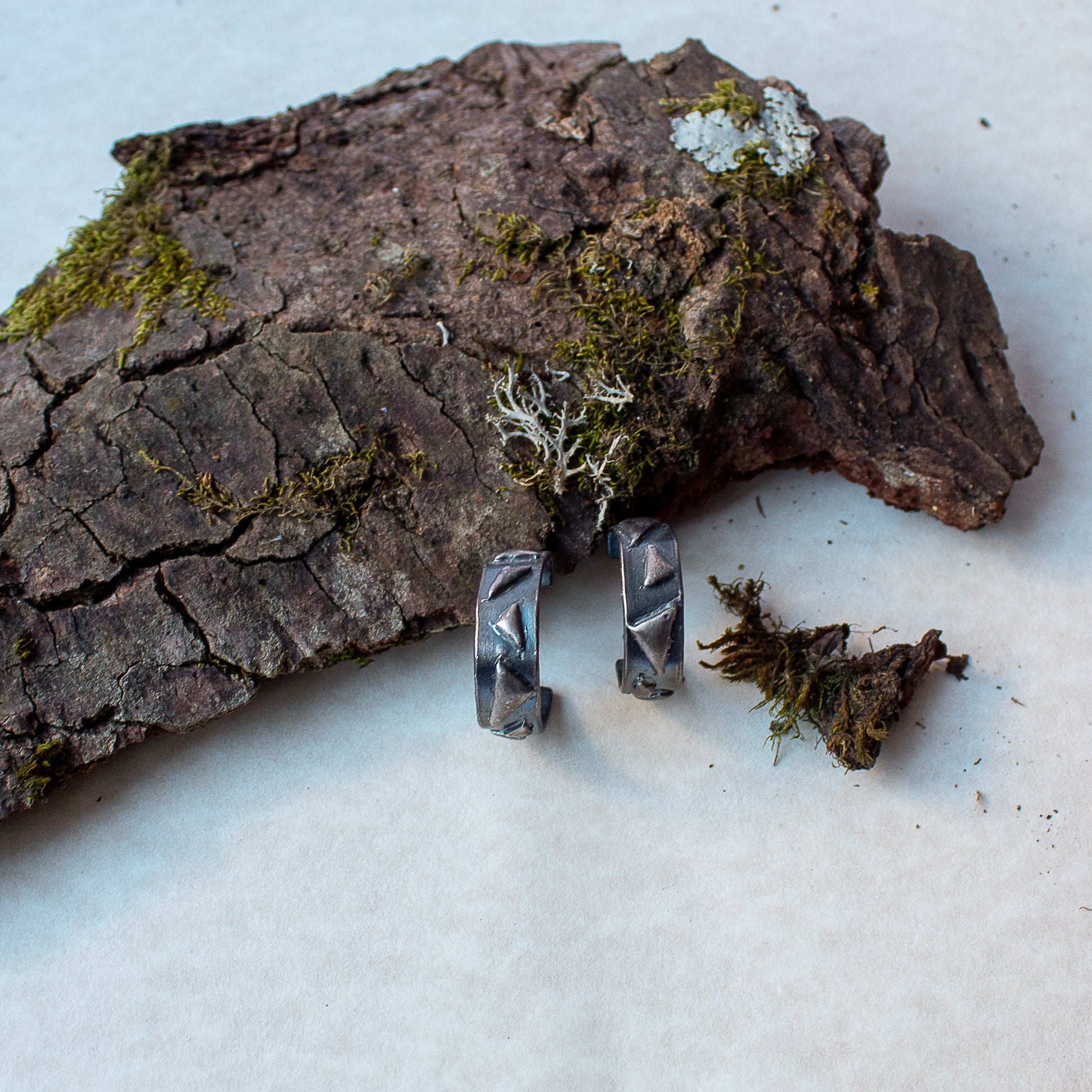 Sterling silver hoop earrings decorated with mini silver triangles. Handtextured and oxidized for more dramatic look. Lightwear and very comfortable.