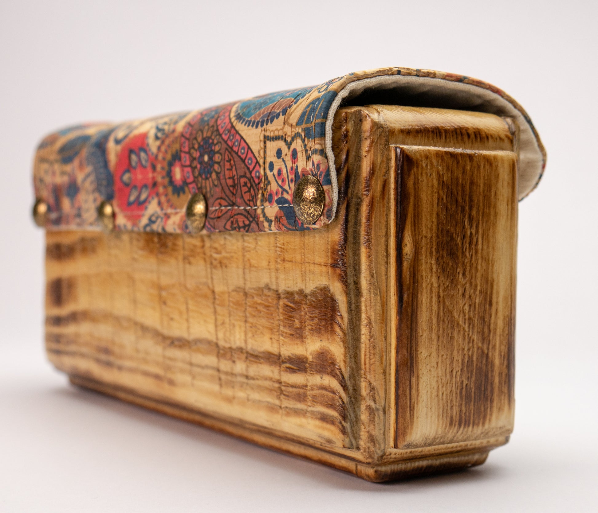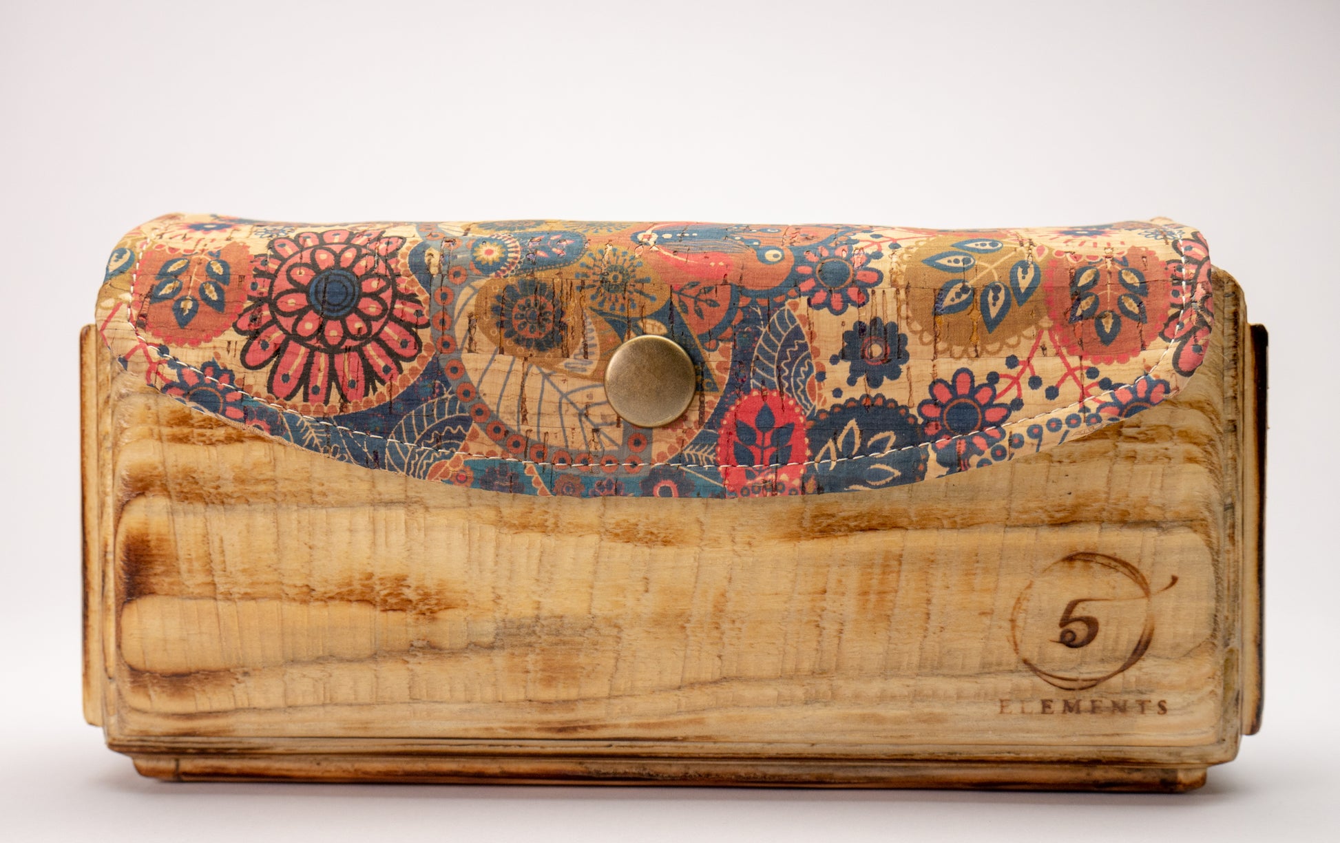 A modern clutch bag made by recycled wood and flower pattern cork leather. An earth friendly hand bag for all occasions. On the inside there is a lining of fabric with pocket. Wood is covered with three coats of transparent wood varnish.
