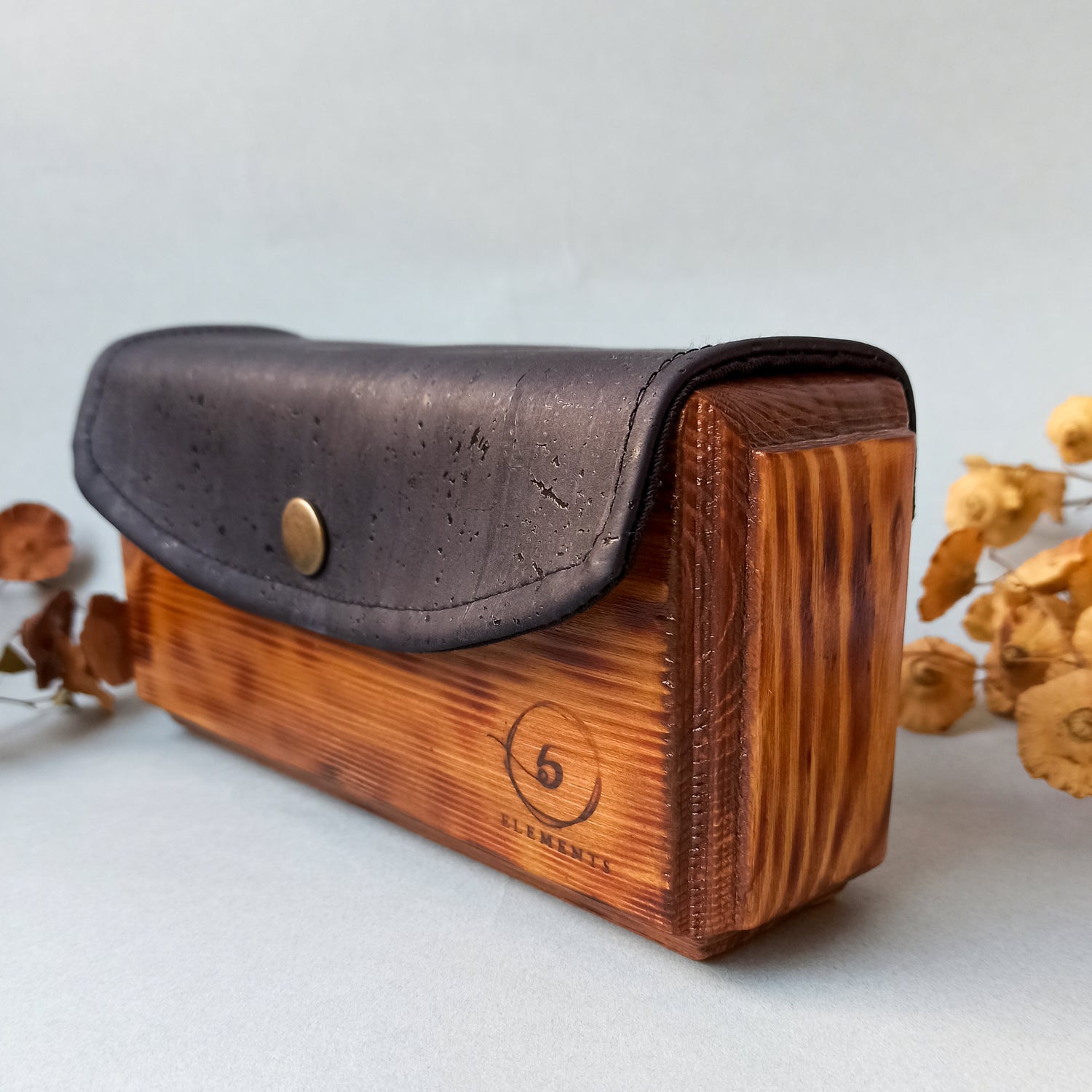 A modern clutch bag made by recycled wood and red cork leather. An earth friendly hand bag for all occasions. On the inside there is a lining of fabric with pocket. Wood is covered with three coats of transparent wood varnish.